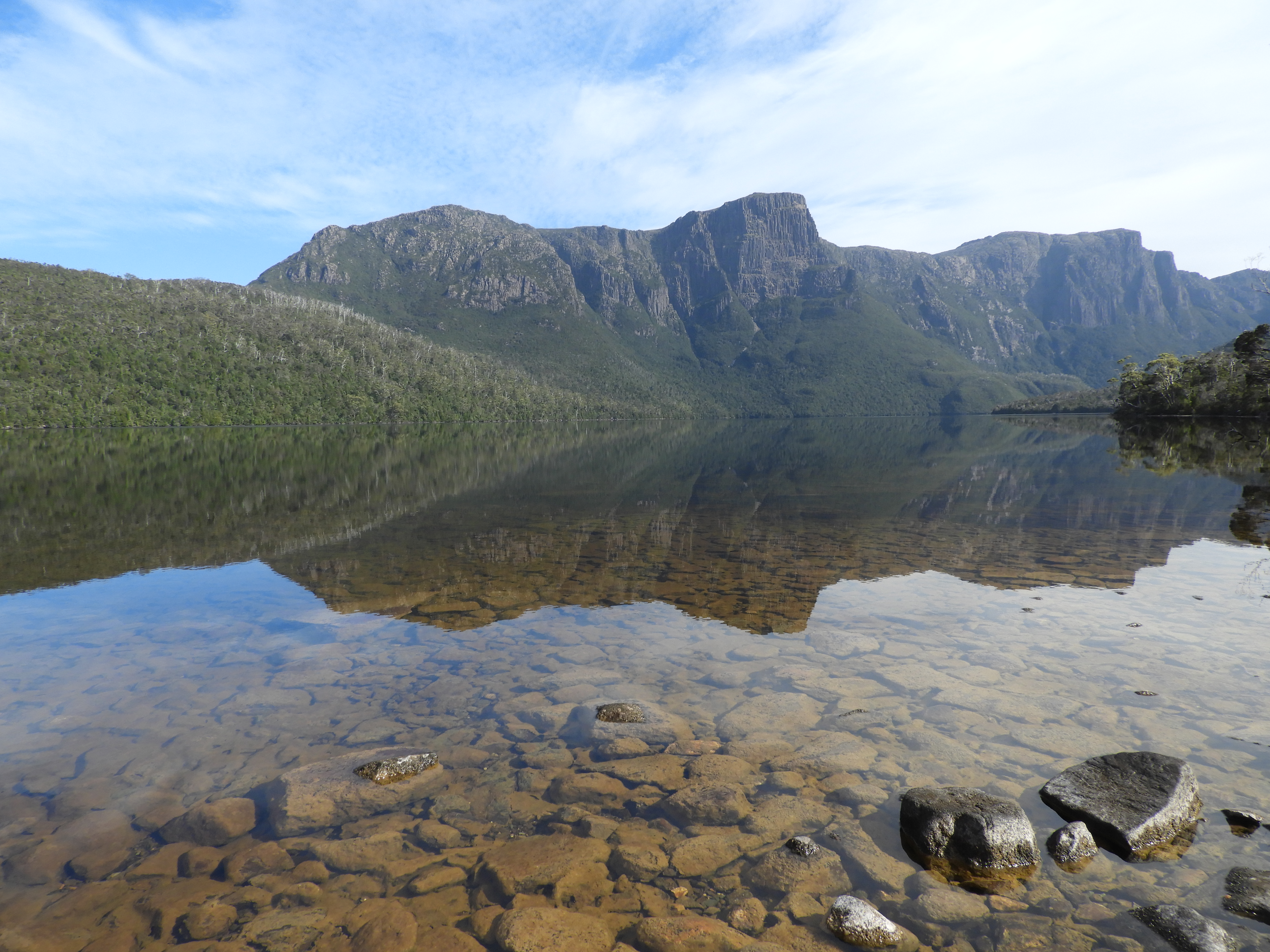 We set off early and I sent Trevor ahead as I knew he was full of adrenaline wanting to catch the early light on the lake for some photography and I took my time and enjoyed the wild flowers beside the track, birds singing and the sensation of being alone in the wilderness. It was worth the last steep climb when I arrived at Lake Judd to find glorious reflections of Mt Anne and overhanging trees in the perfectly still waters of the lake.