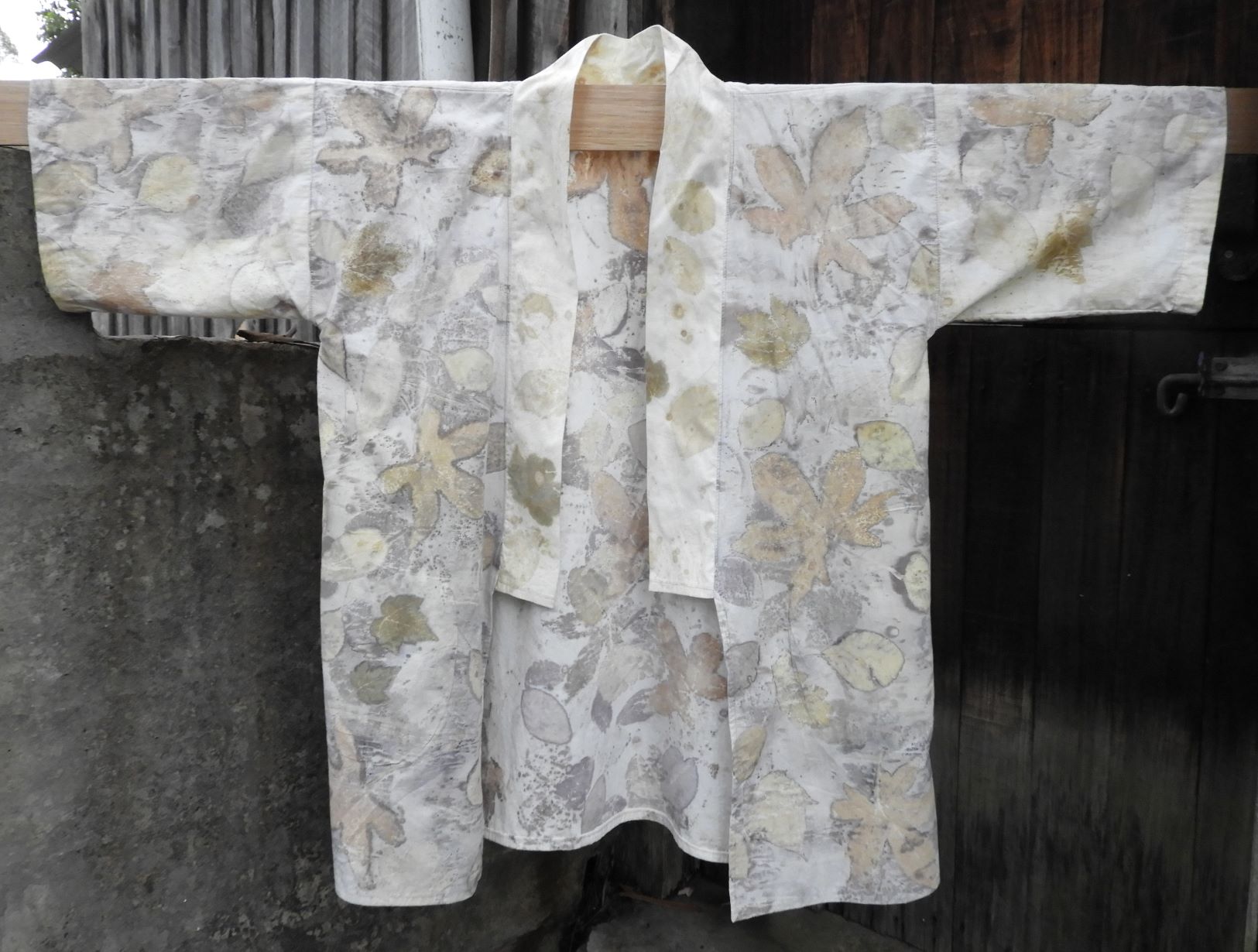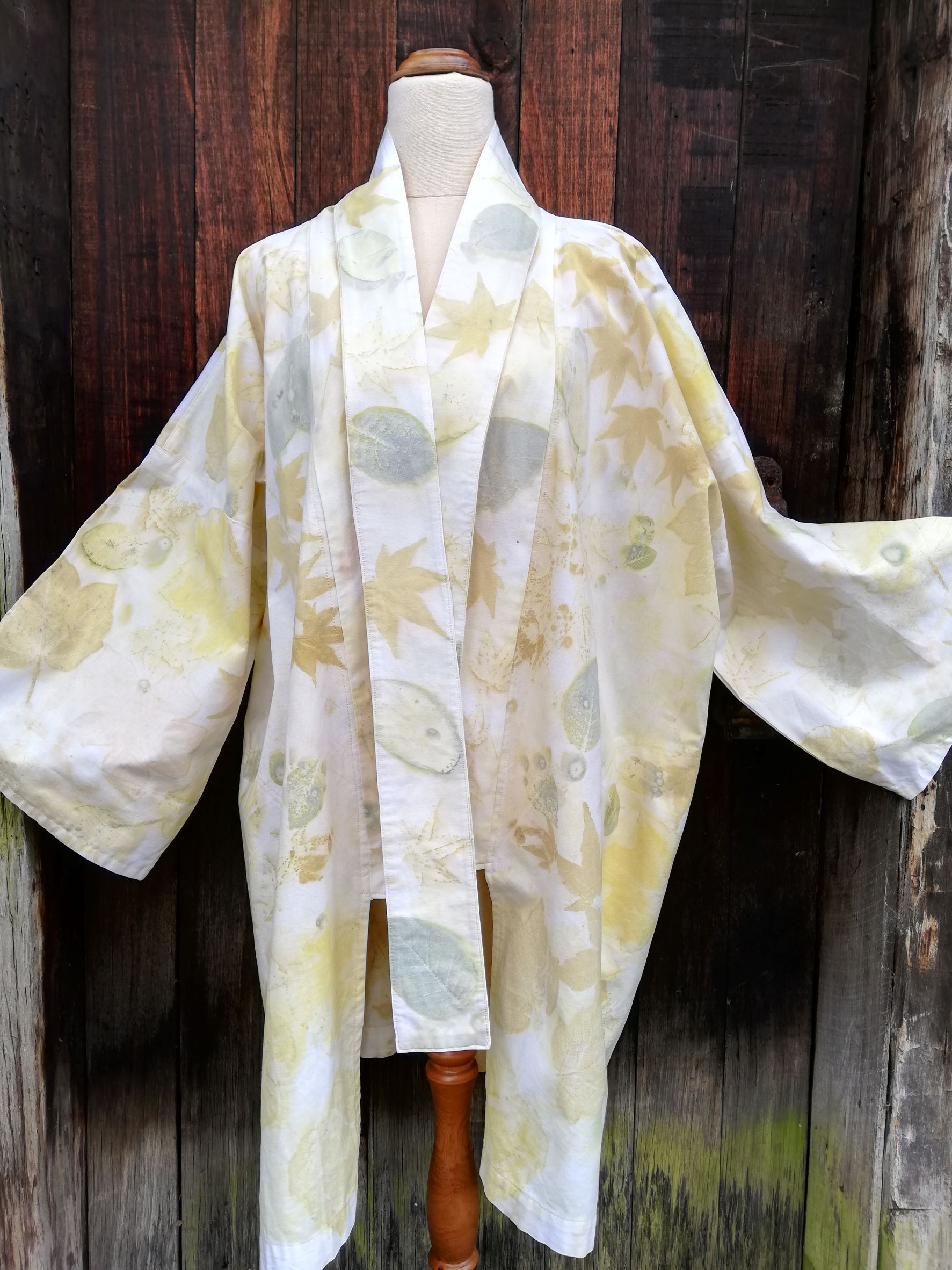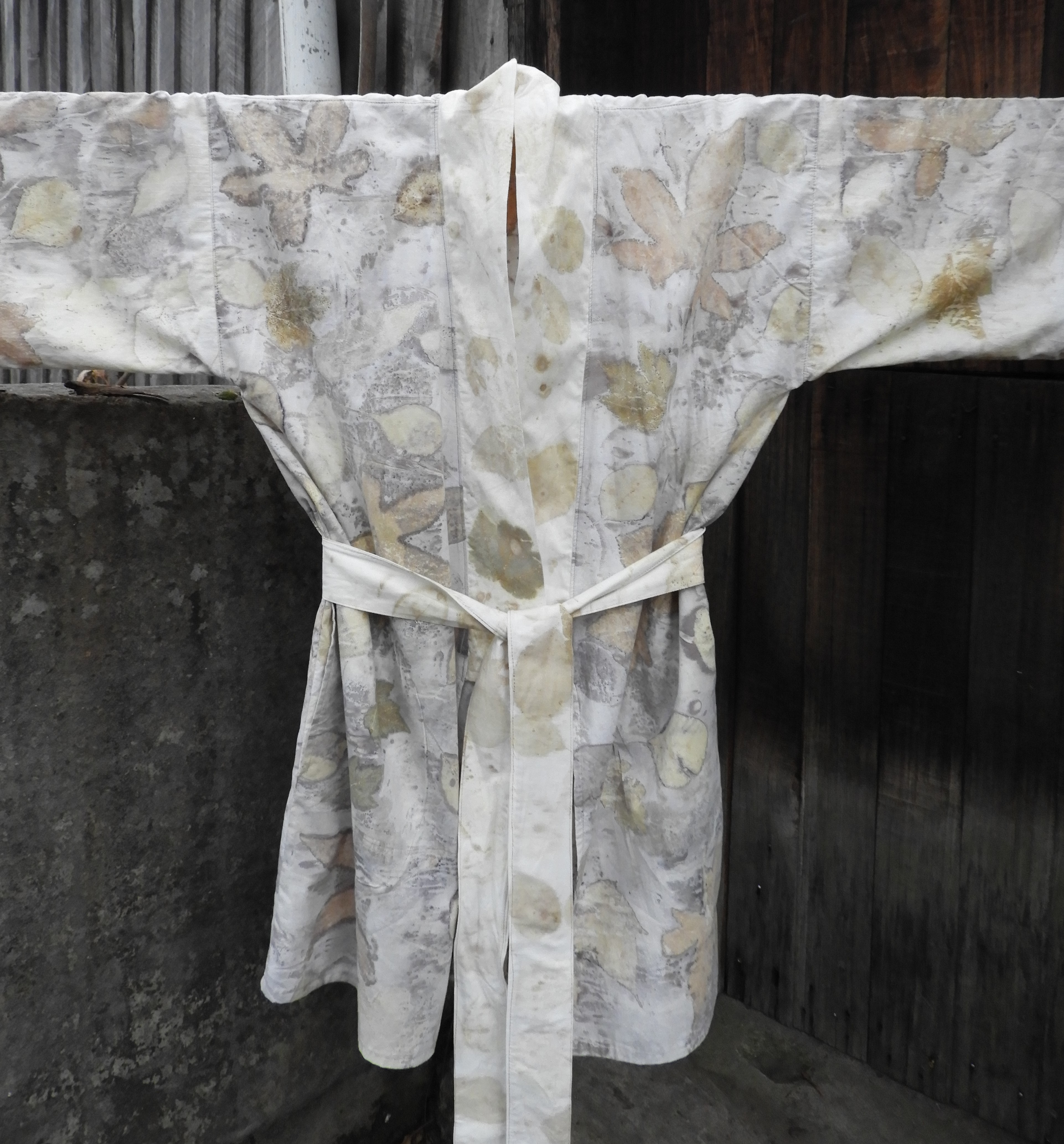 I’m a big fan of upcycling and ecoprinting with natural plant dyes and leaves so it was a small leap from seeing some quality cotton bed linen at the local thrift shop to turning it into an ecoprinted kimono.
