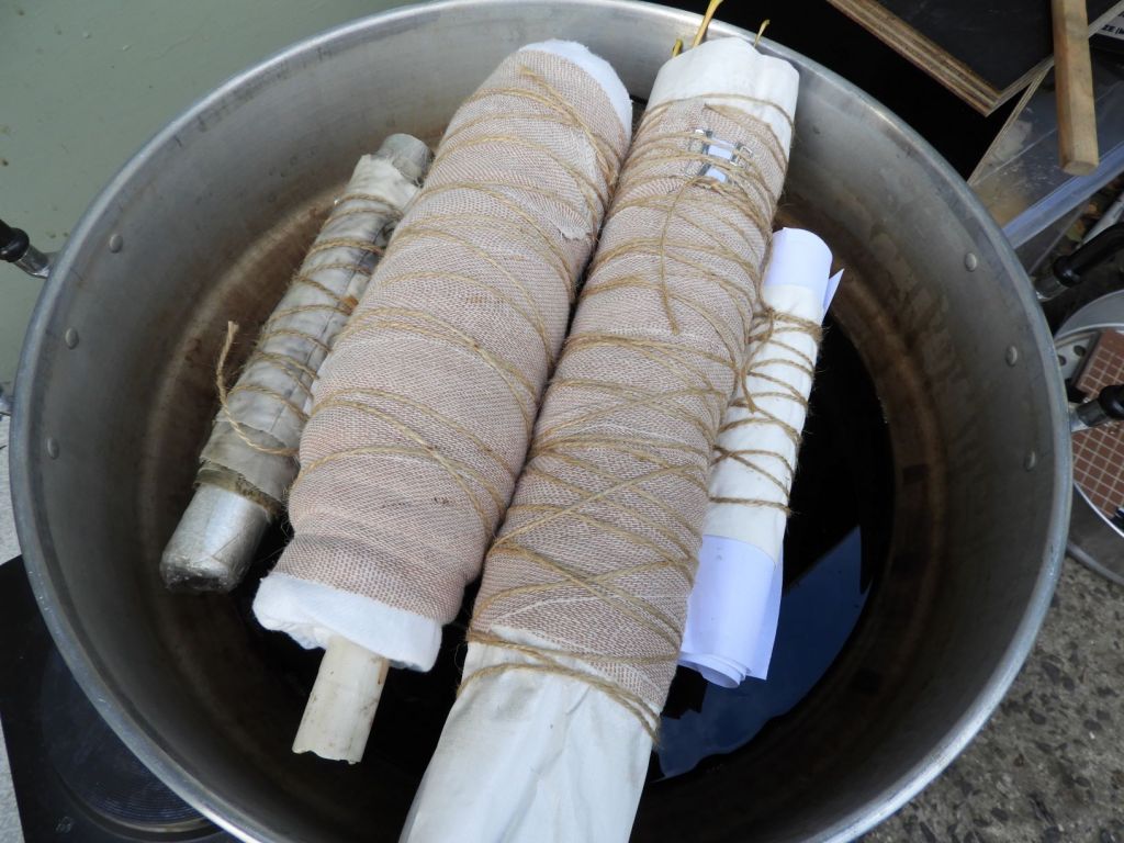 Next I roll the fabric tightly onto a round dowel- it can be metal, pvc or wood. I try to keep the leaves in teh pattern I placed them as I roll. the roll is then tied tightly with string if I want string marks in the pattern or with an elastic bandage if I don’t want any string marks. Then into a steamer to steam for 90 minutes to 3 hours depending on the leaves I’m using- eucalyptus generally take longer steam times.