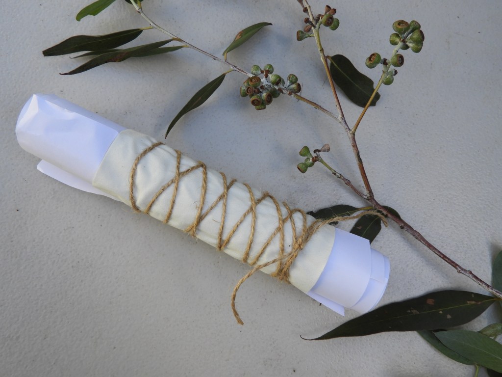 I stretch the fabric out onto a flat table, smoothing out any wrinkles as I go , and then lay the leaves earth side down ( ie the underside of the leaf) onto the fabric to create whatever design I like. Earth side usually prints the best although eucalyptus prints well both sides.
