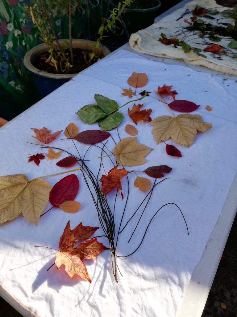 Not all leaves are equal when it comes to giving up dye so if you’re new to it try starting with reliable printing leaves like maples, eucalyptus, rose , sycamore, teak, sumac, black walnut and blackberry depending where you live and what your local leaves are.