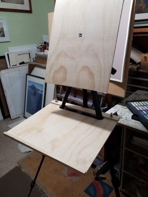 Instead I made my own version using a free Slik tripod a friend gave me, $20 piece of plywood, a few dollars worth of hardware and a couple of hours to put together. It’s very stable and fits a full size box of Unison pastels and a half sheet of Colourfix paper .