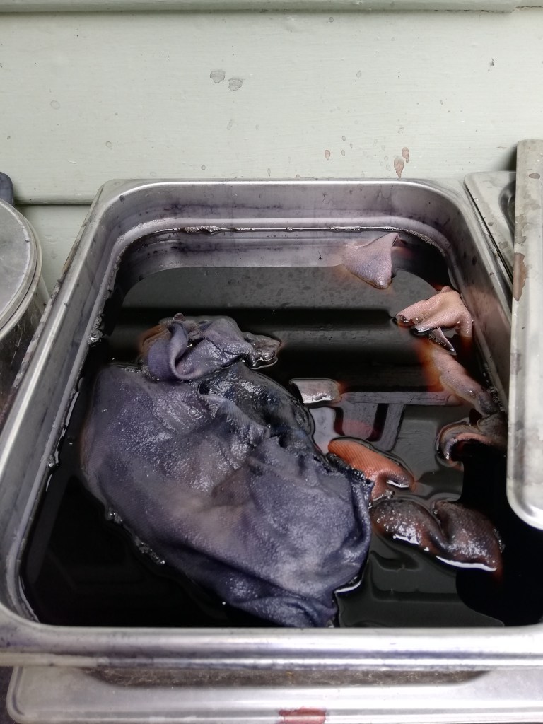 I had three different natural dye baths made up and we tried each dye in our sample pieces so that students could choose the one they preferred for their larger print backgrounds