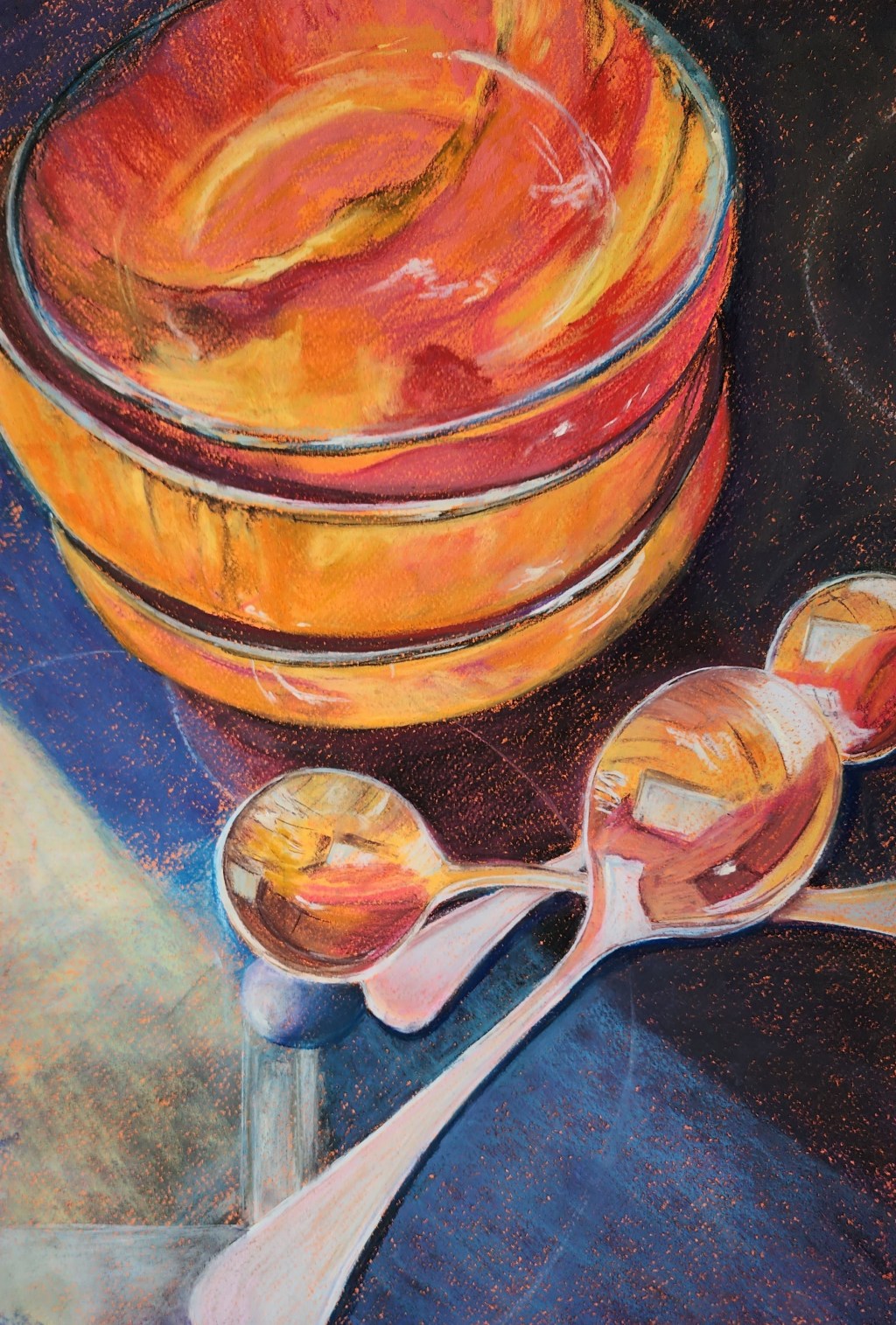 I add a few more glazing layers of lights and darks to the cooktop using some Terry Lugwig soft pastels and cut back into the edges of the spoons to clean them up.