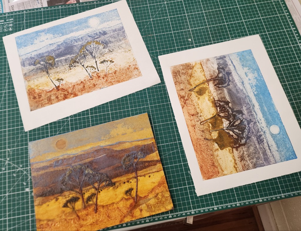 One of the exciting things about collagraph printing is how different prints from the same plate can look depending on the colours chosen for inking and how the ink is wiped from the plate.