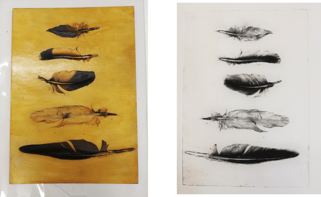 Here five feathers I picked up on a morning walk made an interesting composition when I laid them on a plate so I glued them down, sealed the plate and pulled my first proof an hour later.