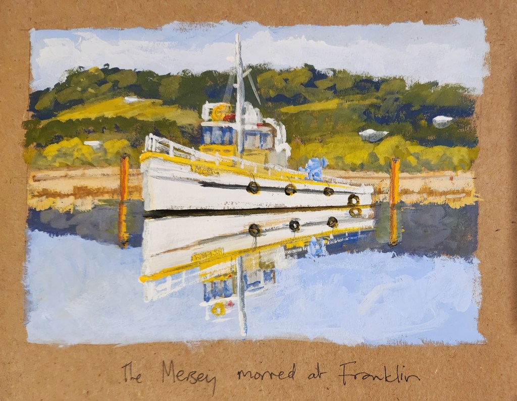 Sometimes I’m so caught up in the moment, and feeling quite pleased that I’ve managed to capture the main element in my painting as I imagined, that I miss the obvious. That happened with today’s postcard painting of the Mersey. The Mersey is a fishing boat that seems to be constantly moored at Franklin, just 10 minutes from our home. I can’t recall ever driving past, in the seven months we’ve lived here, when she wasn’t there. I love her jaunty yellow cabin and all the nautical paraphenalia on her decks, how she reflects so beautifully in the calm water of the mooring channel and how utilatarian she looks beside the sleek yauchts moored alongside.