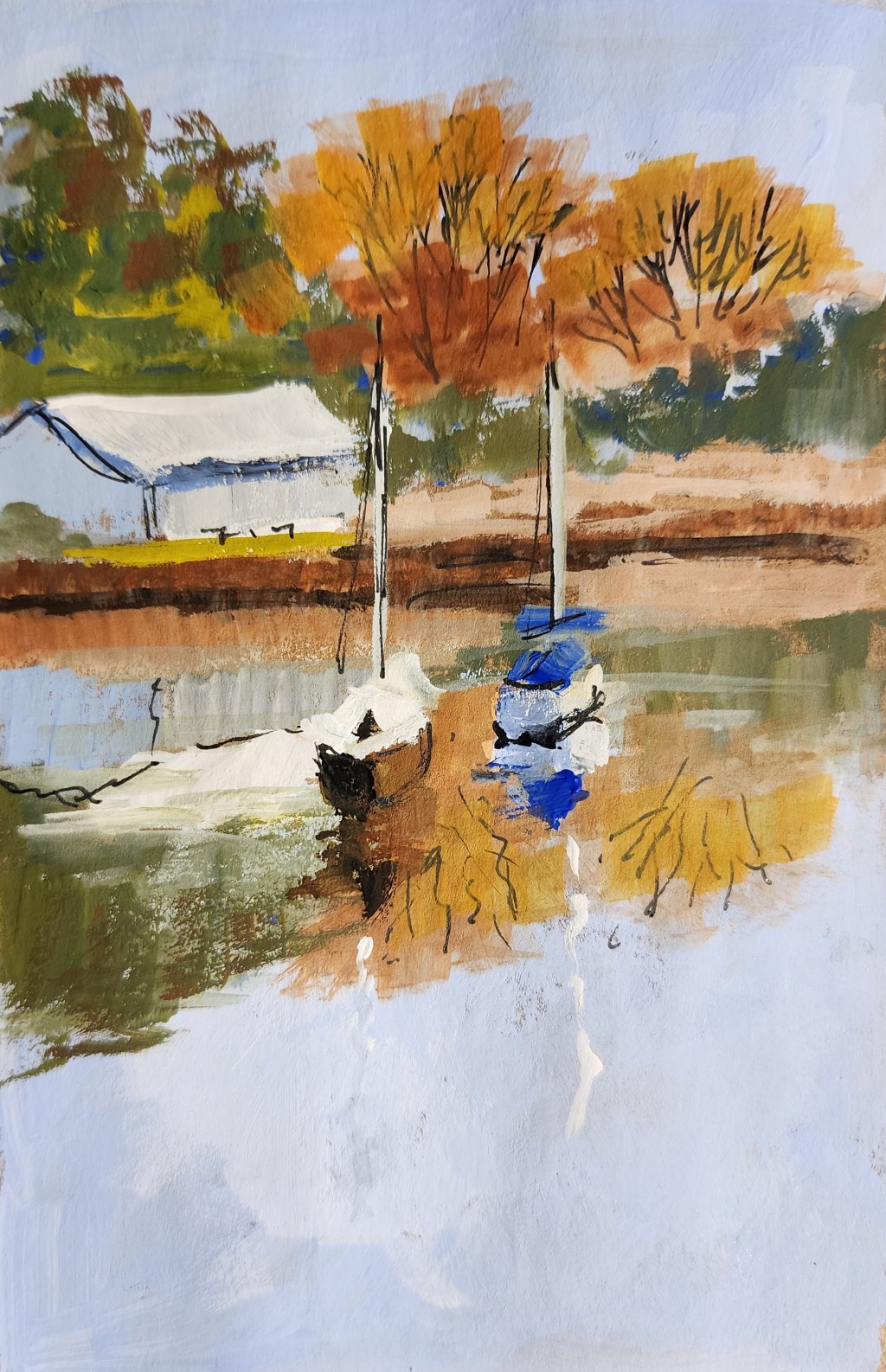 My postcards range from quick sketches concentrating on the idea rather than reality to more detailed painterly works. This one definitely falls into the quick sketch category! Those boats are anatomically incorrect and it’s only the colours and their position anchored near this old shed that make them recognisable.