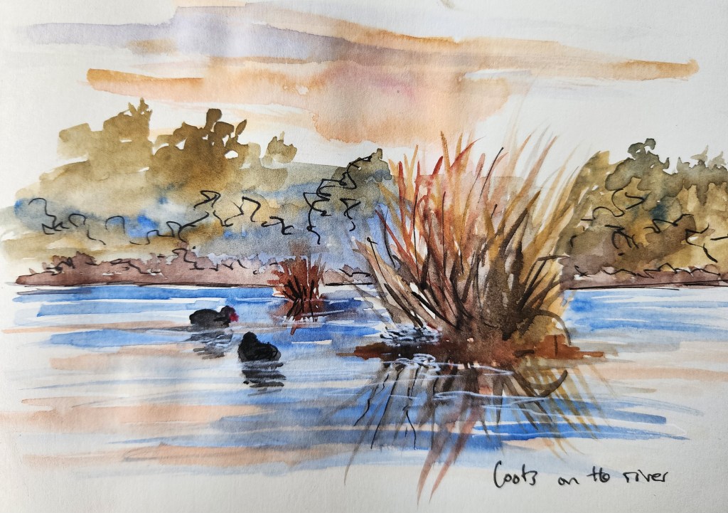 Today’s little postcard sketch captures two coots checking out the nesting sites along the river’s edge.