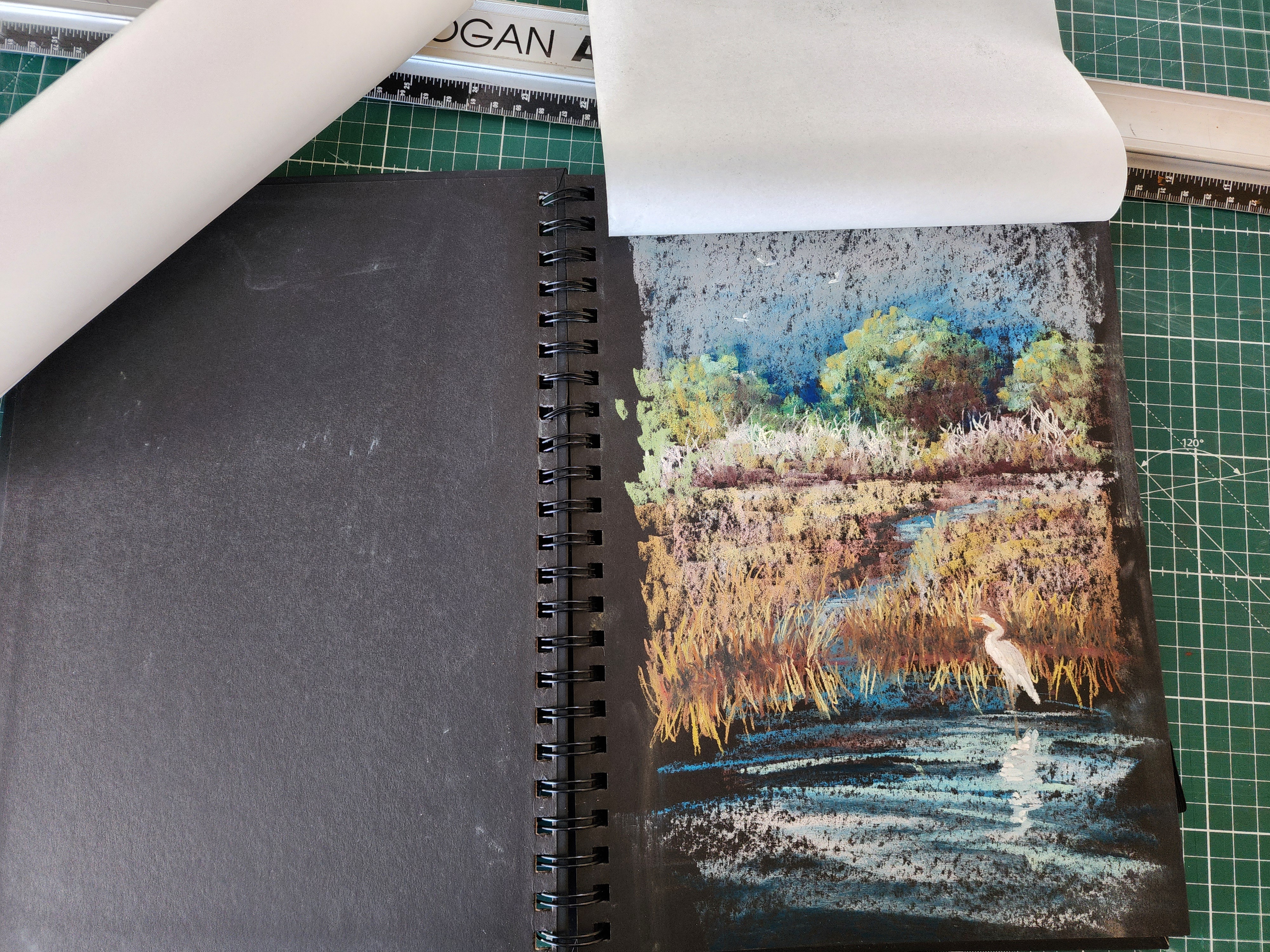 I’ve been wanting to add some pastel sketches to my Life by the River series and I want to keep them in an actual sketchbook as a collection rather than loose scraps of paper. Sounds simple doesn’t it but it’s actually hard to source a pastel sketchbook with interleaved paper to prevent the sketches smearing. I have tried a new fixative that works really well at stabilising the surface and only darkens the colour slightly if the base paper is a very light colour BUT it makes a huge change if using a darker paper. Of course I want to do the sketches on black paper!