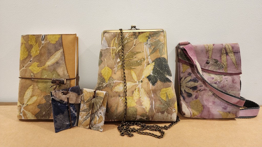 I haven’t posted any ecoprinting for awhile here as I’ve been doing the daily postcard posts so here’s a round up of some of my recent makes. I’ve been mostly working with my eco printed kangaroo leather. I’ve shared a few of my favourites and some maker’s thoughts. If you feel inspired to try your hand at printing with leaves on leather I have a beginner’s guide here.