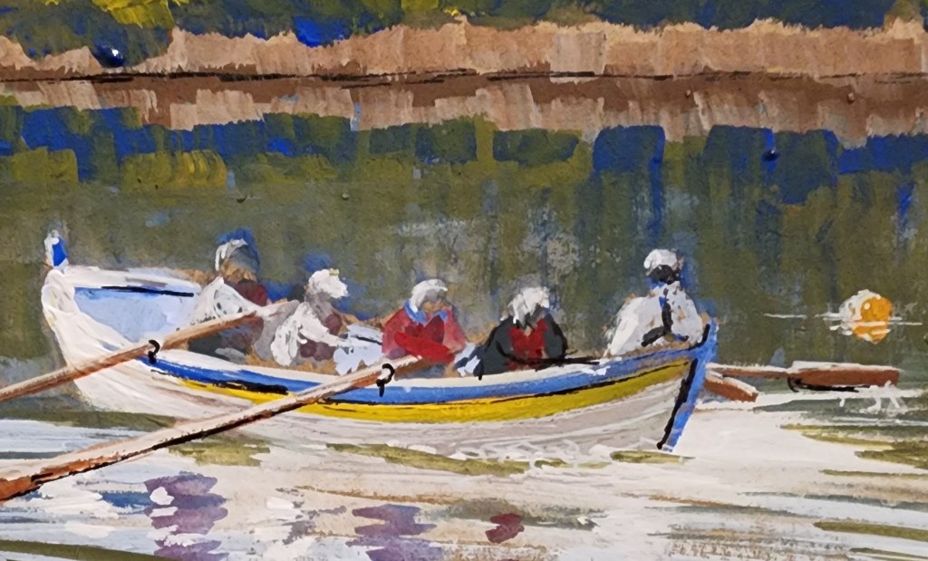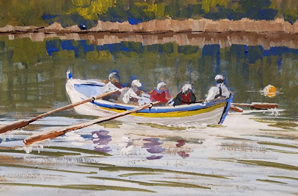 I liked the rippled reflections and the wash as the boat slipped through the water as well as the drips from the oar blades. They all help to suggest the forward movement of the rowboat.