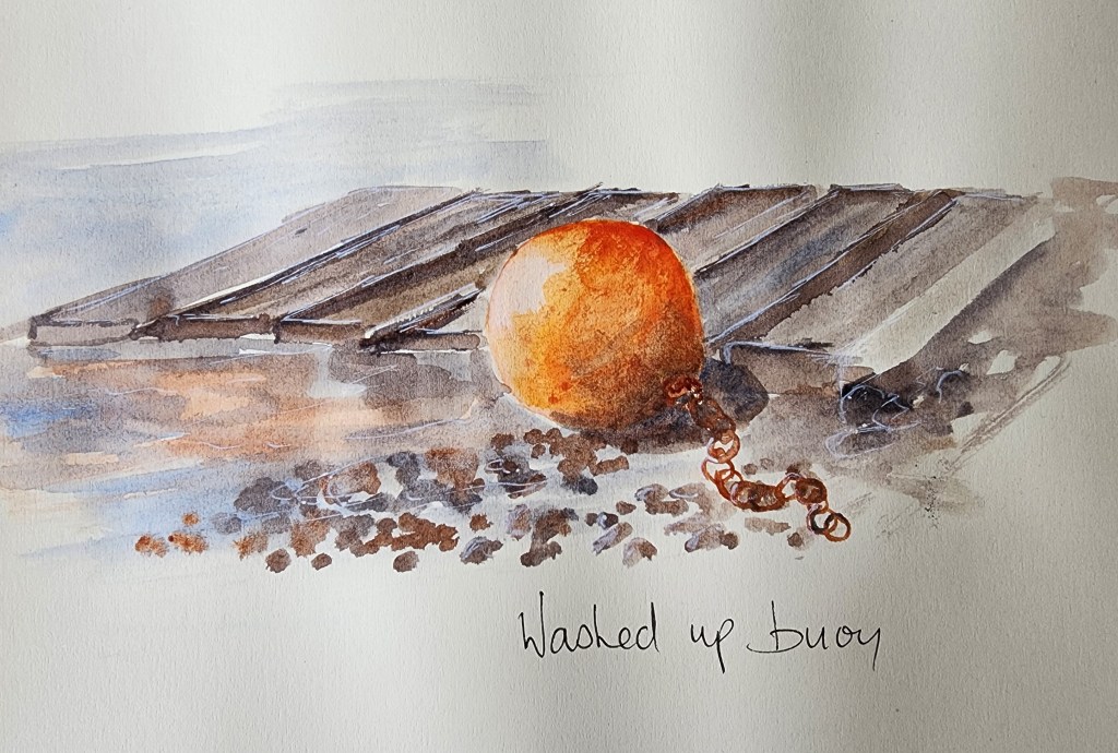 In a recent post I mentioned the flotsom and jetsom that washes up along the river. Today I did a watercolour sketch of a mooring buoy that washed up after a blustery night next to our little jetty.