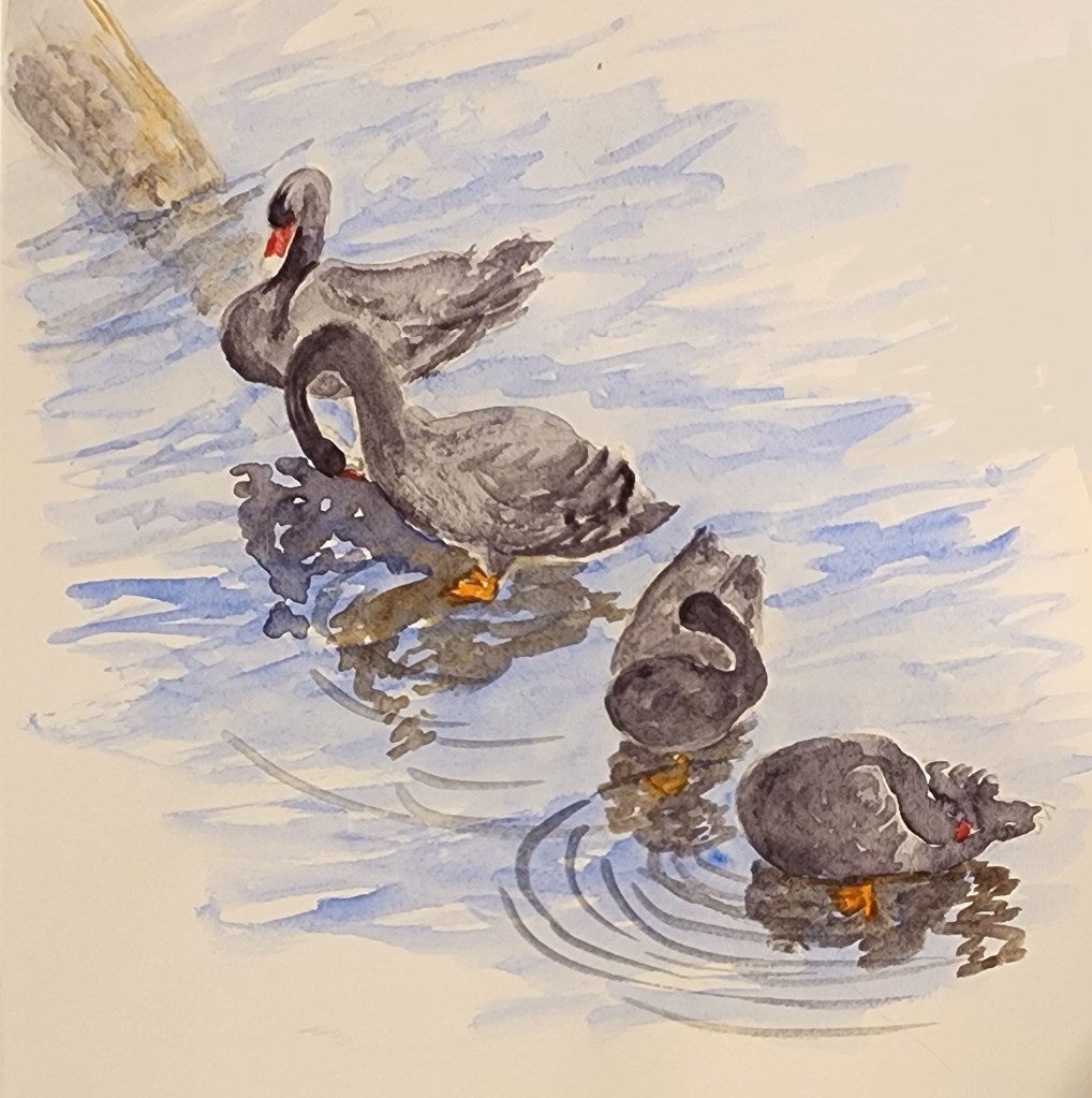 I’m usually a stickler for odd numbers but I think this works because the first swan has a neutral neck position and the other three are all twisting. It kind of sets up a 1/3 rythym and brings it back to odd numbers.