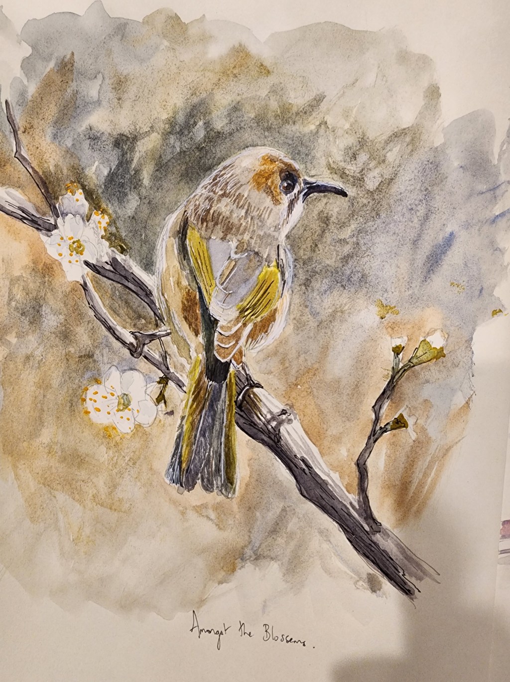 This cresent honeyeater was a real flitter and I really had to get on with clearing the overflowing drain so taking some photos for a later sketch was the answer.