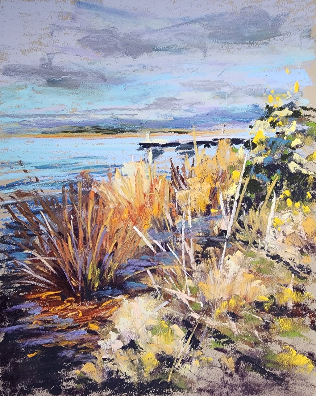This was a fun little exercise in sunshine and shadows . The lucious dark blues and purples in the water set up a lovely vibration against the orange and yellows of the reeds.