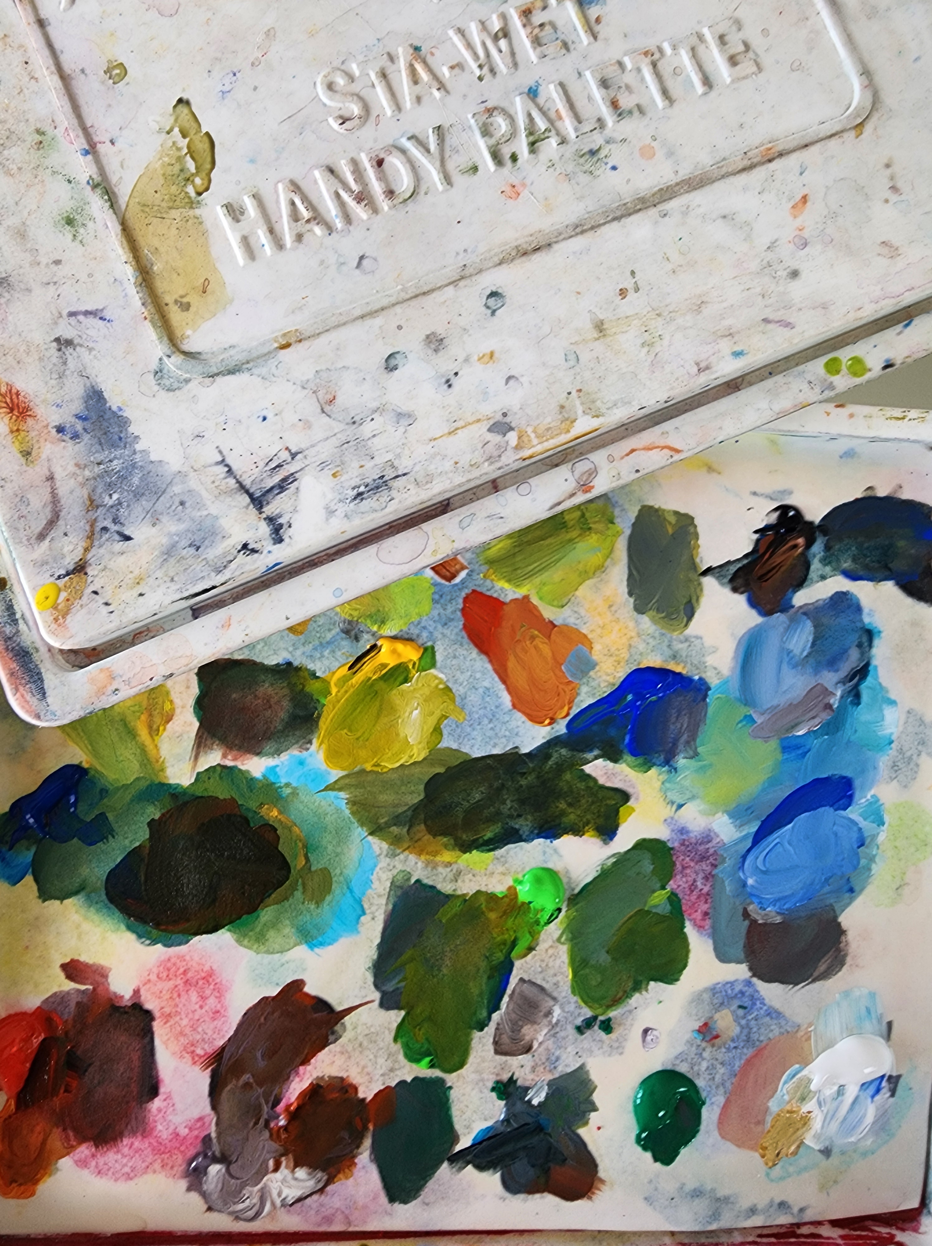 I’ve pinched one of my small stay wet palettes from the studio to keep my acrylic gouache paints workable and it’s made such a difference. No more dried up and wasted paint. I just pop on the lid and store it in the fridge between postcards.