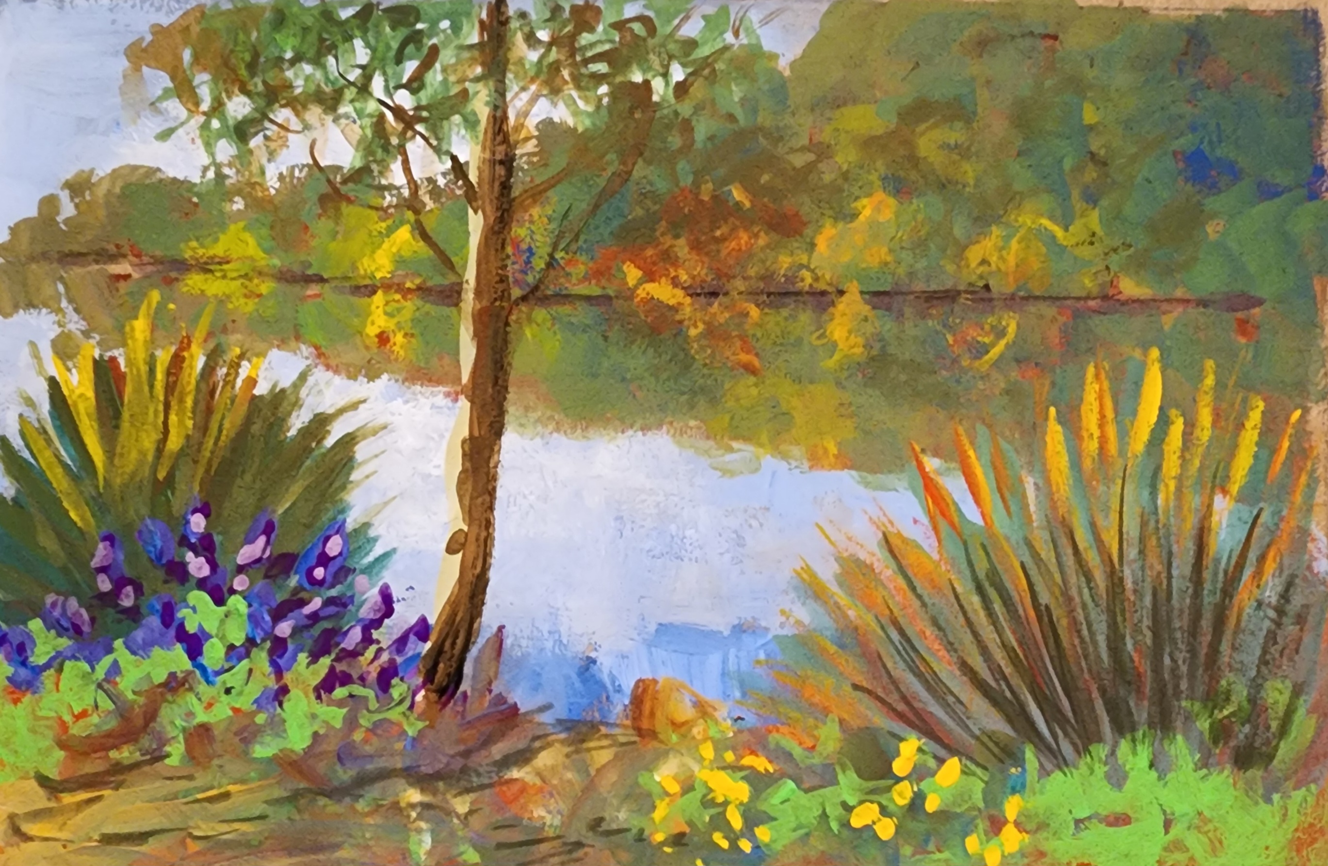 This is looking down the river from Postcard No 96 and the flowers were actually there in this one. I should have left out the tree…it looked better without it! Somehow I’ve mucked up the far shoreline and it bends right where the trunk hits it which makes it look like the dark edge of the bank is forming two branches. I’ll go back and sort that out sometime or it will haunt me.