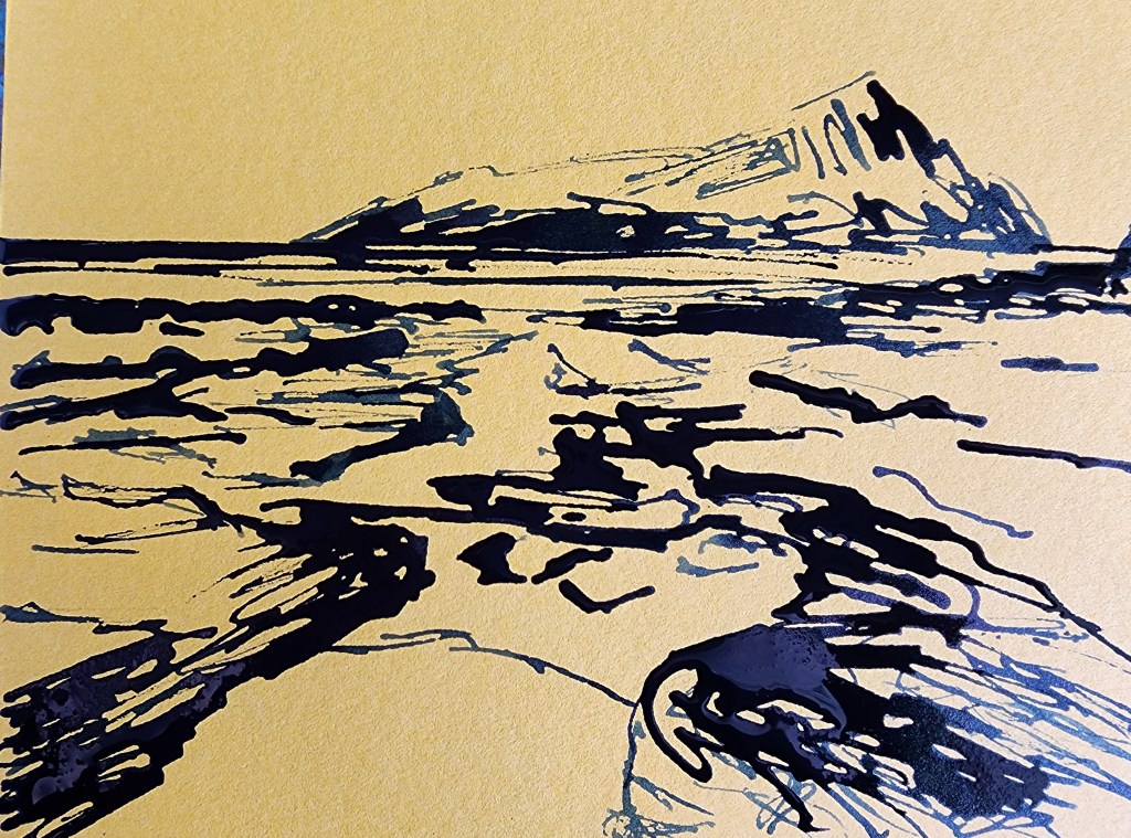 I did this one on a scrap of yellow matboard with some Art Spectrum indigo ink and a dropper. It was really fun to apply the ink. I filled the dropper and then gently released the ink as I dragged it across the matboard…more ink for the darker areas and then dragging it without squeezing for the broken linework.
