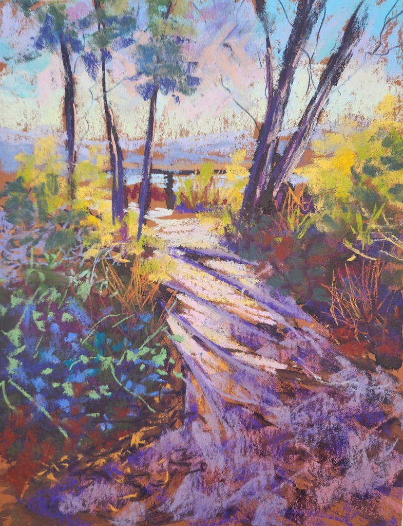 As with a lot of things in life overthinking can lead to confusion and overworking a subject. A while ago I did a lovely little gouache track postcard ( well I loved it anyway) and then some time later I did an upscaled version in pastel. I wanted to try a different approach and I was fairly happy with it until I did this little 15 minute demo in class today!