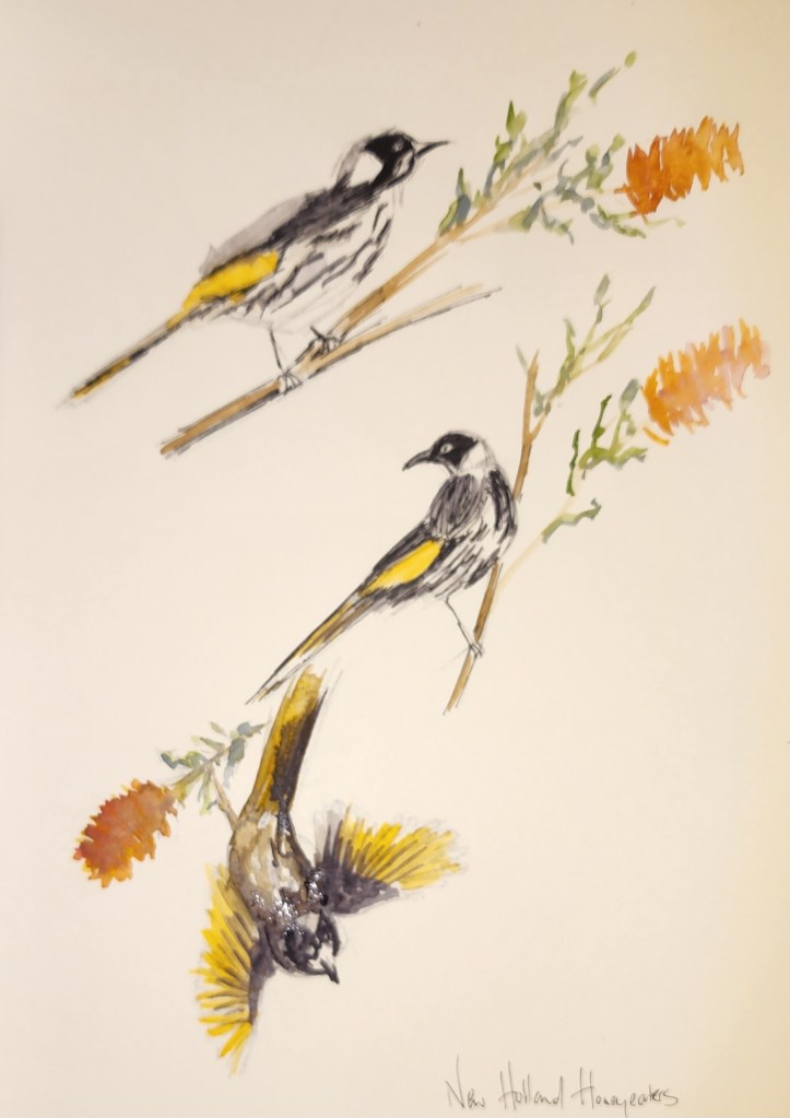 If the sprinkler goes on it really sends them crazy…they absolutely love the water. They’re also enjoying the banksia flowers at the moment so my postcard today features some of our feathered garden friends.