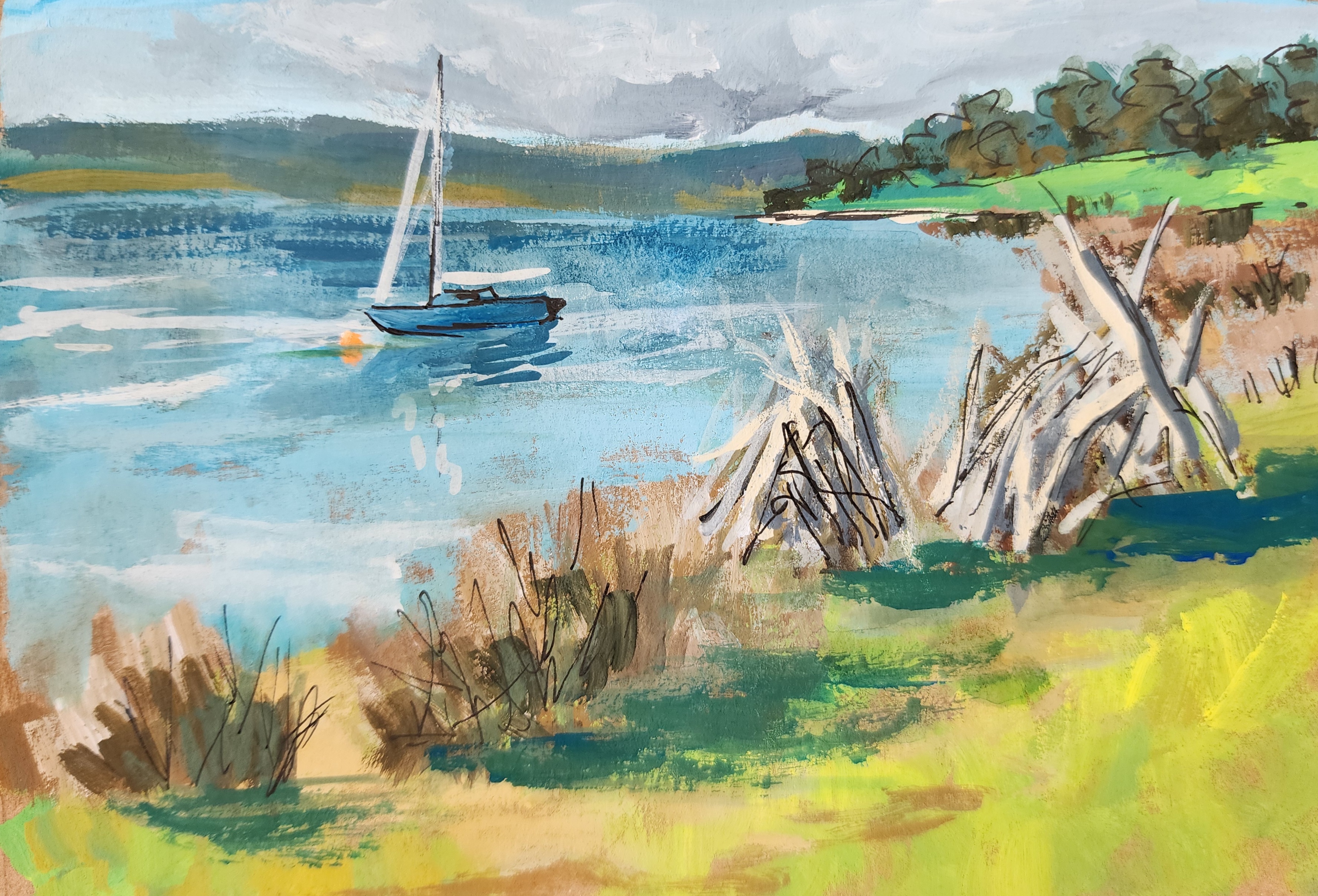 I’m always fascinated by how much driftwood gets washed up on the banks of the river and how many branches get mired down in the river itself. Today’s postcard is of two big piles of driftwood that sit beside the road between Castle Forbes Bay and Franklin. The big one is quite an odd shape which I haven’t really captured. They remind me of bonfires from my childhood but i don’t think they are destined for the fire as they’ve remained untouched by flame in the twelve months we’ve lived here.