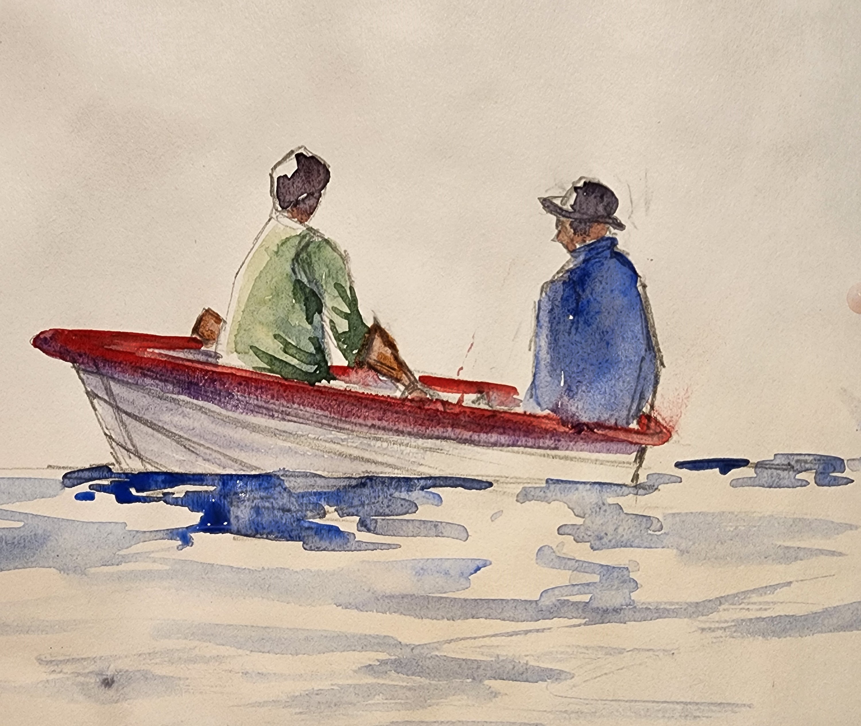 I finished the day with a little watercolour postcard of a very small dinghy I spotted rowing out to a moored boat. I was fascinated by how low it sat in the water.