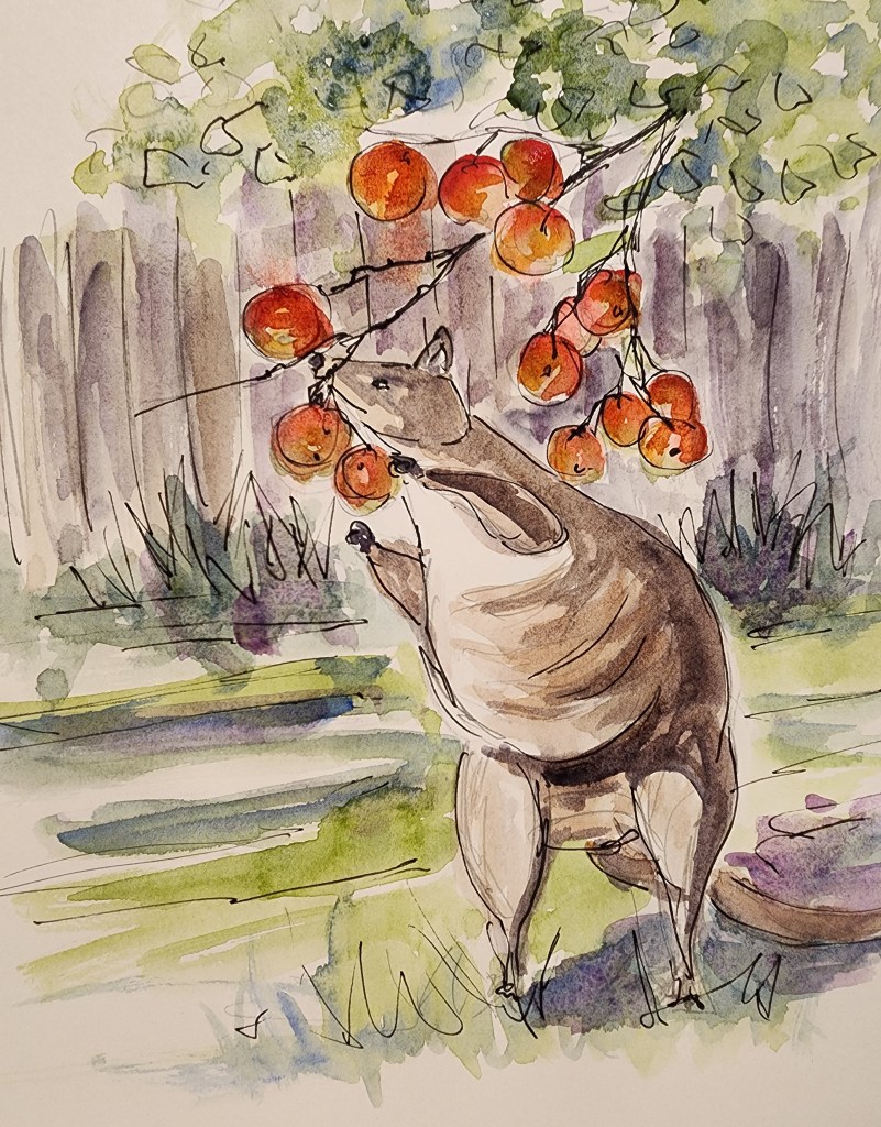 Here’s the furry, not feathered, culprit, happily plucking the low hanging fruit in broad daylight while my husband chatted away to them.