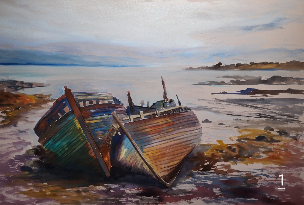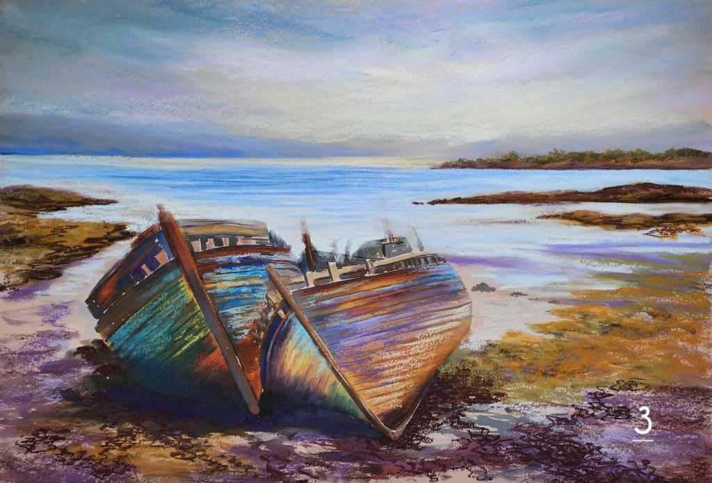 We spent one very damp and overcast day driving around the spectacular Mull coast and there was one place that captivated both me and my husband. We pulled up at the loch edge and there were three derelect boats leaning crazily together on the shore amidst the rocks and seaweed. The paint was peeling and they were full of character. Out came our cameras and we spent quite a bit of time taking photos and simply enjoying the atmosphere. I knew it would be one of my first studio paintings once I was home.