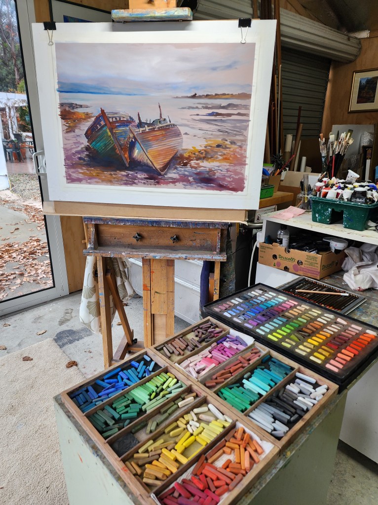 I started with an acrylic ink underpainting on the Colourfix pastel paper. I love how easy it is to get the bones of the subject down in ink. In this case I wanted to get a really well drawn image of the baots and capture the colourful peeeling paint.
